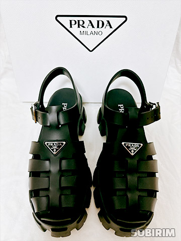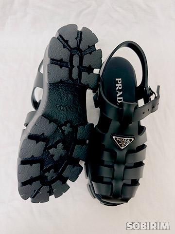고무 소재가 특징인 프라다 대표 샌들 제품으로,